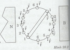 Hình 28.2 vẽ cắt ngang một khung dây dẫn có dòng điện chạy qua được đặt trong từ trường. Ban đầu hai cạnh của khung dây có vị trí 1. Do tác dụng của lực điện từ, khung quay lần lượt qua các vị trí 2, 3, 4, 5, 6.