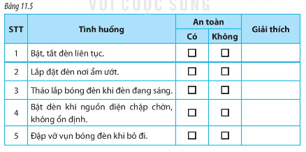 Các tình huống trong Bảng 11.5 có đảm bảo an toàn khi sử dụng đèn điện không? Điền dấu ✔vào các ô để xác định phương án trả lời và giải thích