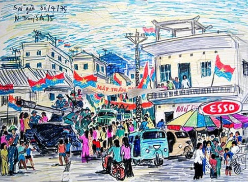 Bức kí họa phản ánh không khí vui mừng, hân hoan của quân và dân ta trong ngày 30-4-1975.
