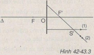 Trên hình 42-43.3 có vẽ trục chính Δ, quang tâm O, hai tiêu điểm F, F của một thấu kính, hai tia ló 1, 2 cho ảnh S của điểm sáng S.