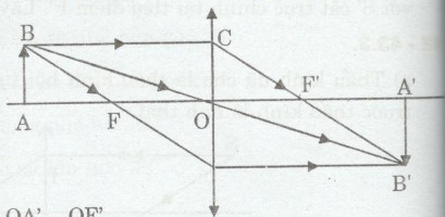 \(\Rightarrow \displaystyle{{OC} \over {A’B’}} = {{{\rm{OF’}}} \over {F’A’}}\)  (2)