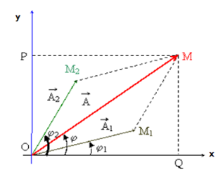 Theo hình vẽ: \(\overrightarrow A  = \overrightarrow {{A_1}}  + \overrightarrow {{A_2}} \,\,\,\,\,\,\,\,\,\,\left( 1 \right)\)