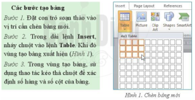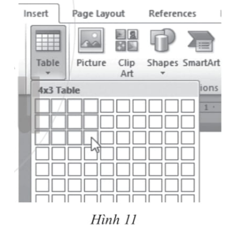 Em hãy điền vào chỗ chấm (…) các cụm từ: cần chèn bảng, Insert, Tables, vùng tạo bảng thích hợp để nhận được các bước tạo bảng trong phần mềm Soạn thảo văn bản (Hình 11):