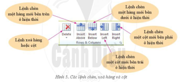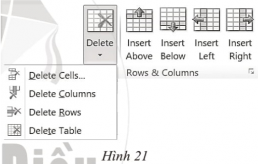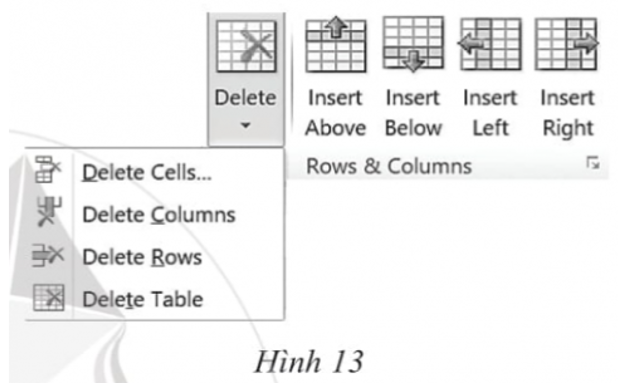 Sử dụng các lệnh trong Hình 13, điền vào chỗ chấm (…) trong các câu sau đây để nhận được cách chèn thêm hoặc xóa hàng hay cột của bảng: