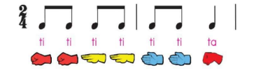 Đọc mẫu tiết tấu, sau đó kết hợp đọc nhạc theo kí hiệu nốt nhạc bàn tay