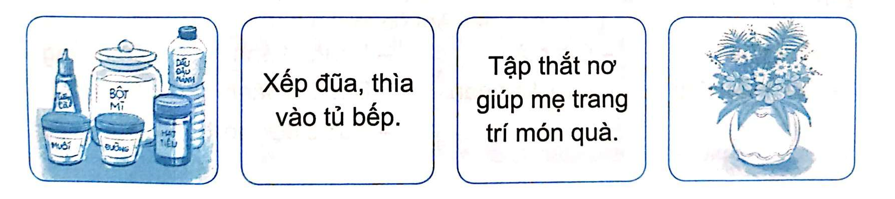 – Sau khi được mẹ giúp đỡ, em thấy mình đã biết cách sắp xếp các hũ gia vị và xếp đũa, thìa vào tủ bếp hay chưa? Tự mình đánh giá mức độ hoàn thành công việc.