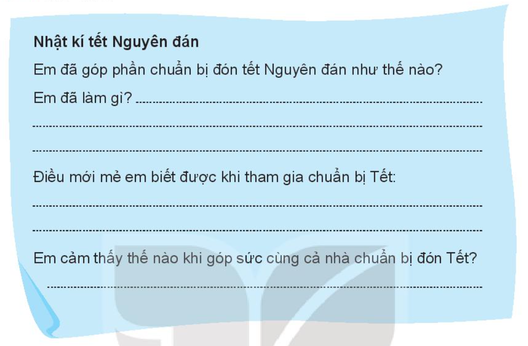 Ghi lại những điều em đã làm cùng người thân để chuẩn bị đón Tết, sau đó hãy nêu cảm nhận của em kkhi được góp sức cùng cả nhà chuẩn bị đón Tết