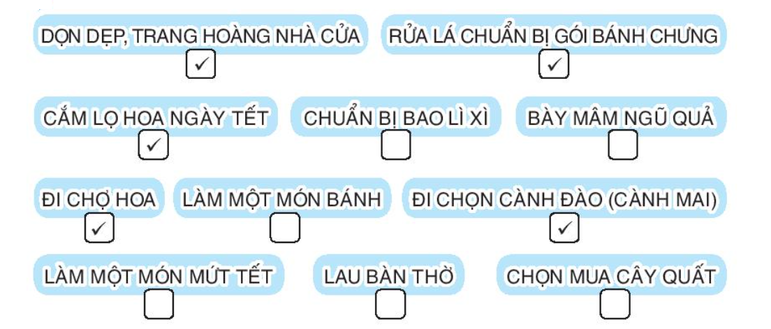 Cùng người thân thực hiện các hoạt động đón Tết trang 37 VBT Hoạt động trải nghiệm 2 – Kết nối tri thức