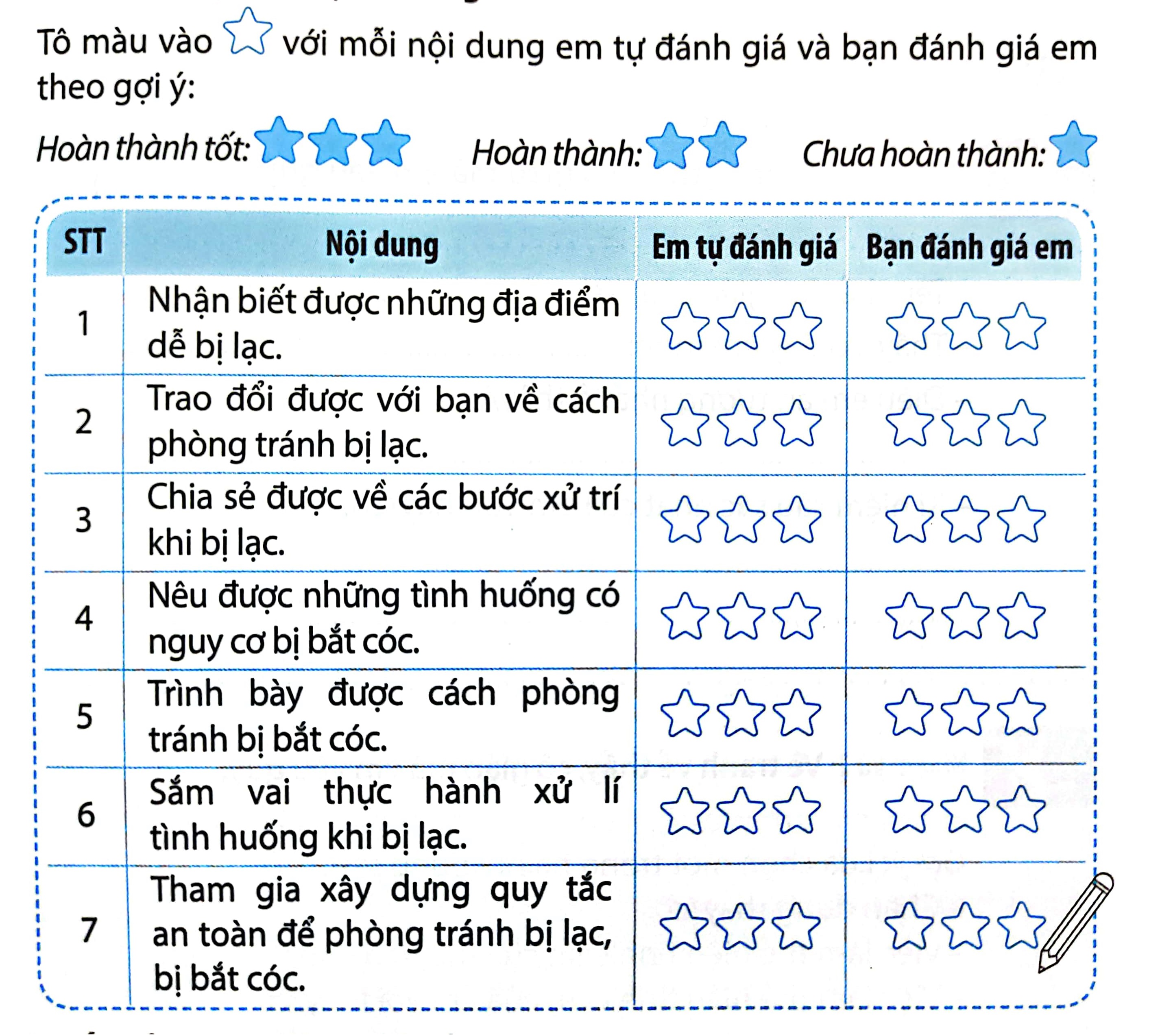 – Đầu tiên em đọc nội dung của bảng đánh giá, thông qua những lần tham gia hoạt động, em thấy mình đã hoàn thành tốt những yêu cầu của bảng đưa ra chưa? Tự mình đánh giá mức độ hoàn thành của bản thân.