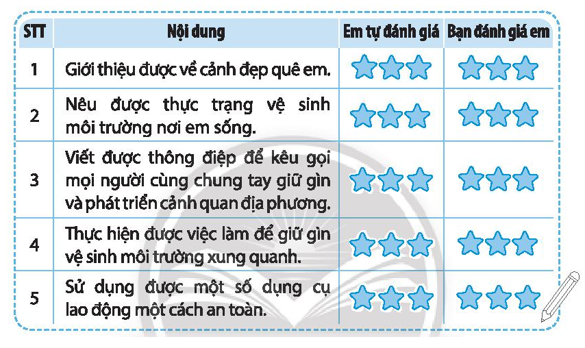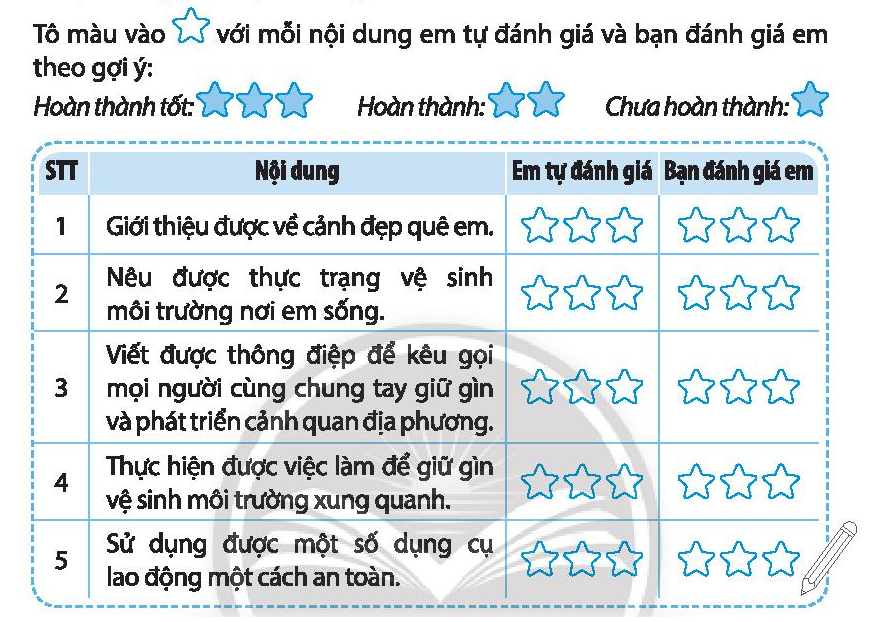 – Đầu tiên em đọc nội dung của bảng đánh giá, thông qua những lần tham gia hoạt động, em thấy mình đã hoàn thành tốt những yêu cầu của bảng đưa ra chưa? Tự mình đánh giá mức độ hoàn thành của bản thân.