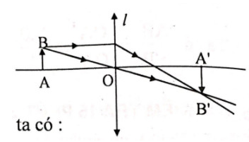 \frac{{AB}}{{A’B’}} = \frac{{OA}}{{OA’}} \Leftrightarrow \frac{{1,5}}{{A’B’}} = \frac{3}{{0,05}} \hfill \\