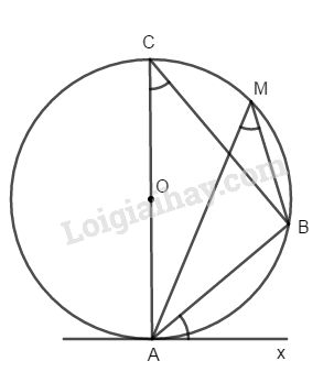 Cho góc nhọn AMB nội tiếp trong đường tròn (O). Trên nửa mặt phẳng bờ AB không chứa M, vẽ tia Ax sao cho \(\widehat {xAB} = \widehat {AMB}\). Chứng tỏ Ax là tiếp tuyến của (O).