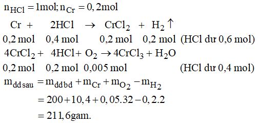 Câu 10. Hòa tan 10,4 gam crom bằng 200 gam dung dịch chứa HCl 18,25%. Sục không khí vào dung dịch sau phản ứng đến phản ứng hoàn toàn bỏ qua sự bay hơi của nước và sự hòa tan vật lý của các chất khí. Khối lượng dung dịch thu được là