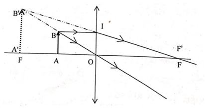 Vì vật đặt trong khoảng tiêu cự (d < f) vậy qua TKHT ta thu được một ảnh ảo, cùng chiều lớn hơn vật như hình vẽ: