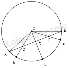 Câu 2 (3 điểm). Cho đường tròn \((O)\) và dây \(AB\) không qua tâm \(O\). Trên dây \(AB\) lấy các điểm \(C, D, E\) sao cho \(AC = CD = DE = EB\). Các tia \(OC, OD, OE\) lần lượt cắt đường tròn tại \(M, N\) và \(P\). Chứng minh rằng: