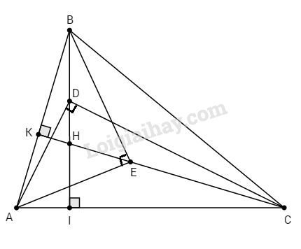 Bài 3. Cho tam giác ABC có ba góc nhọn, các đường cao BI, CK cắt nhau tại H. Trên đoạn HB, HC lần lượt lấy các điểm D và E sao cho \(\widehat {ADC} = \widehat {AEB} = 90^\circ .\)
