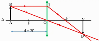 Vật AB đặt trước thấu kính hội tụ có tiêu cự f và cách thấu kính một khoảng OA  cho ảnh A’B’ ngược chiều cao bằng vật AB thì \(OA = 2f\)