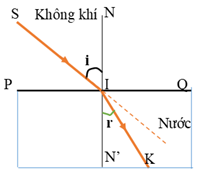 Khi tia sáng truyền từ nước vào không khí thì góc tới lớn hơn góc khúc xạ: \(i > r\)