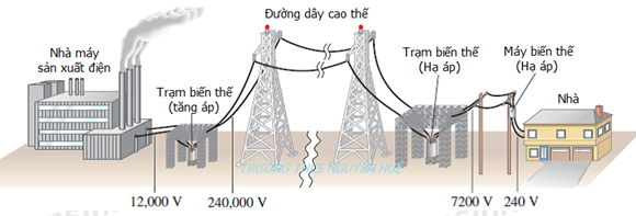 Truyền tải điện năng từ các nhà máy điện đến nơi tiêu thụ thông qua việc sử dụng máy biến áp ở các giai đoạn khác nhau: