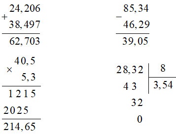Đặt tính rồi tính theo các quy tắc đã học về phép cộng, trừ, nhân, chia số thập phân.