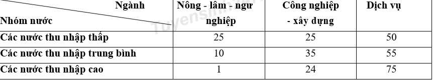 Căn cứ vào bảng số liệu, cho biết nhận xét nào sau đây đúng về cơ cấu GDP của nhóm nước thu nhập thấp so với các nhóm khác?