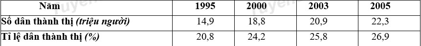 Để thể hiện số dân thành thị và tỉ lệ dân thành thị ở nước ta giai đoạn 1995 – 2005, biểu đồ nào sau đây thích hợp nhất?