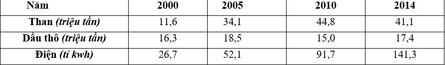 Căn cứ vào bảng số liệu, cho biết nhận xét nào sau đây đúng về sản lượng than, dầu thô và điện của nước ta giai đoạn 2000 – 2014?