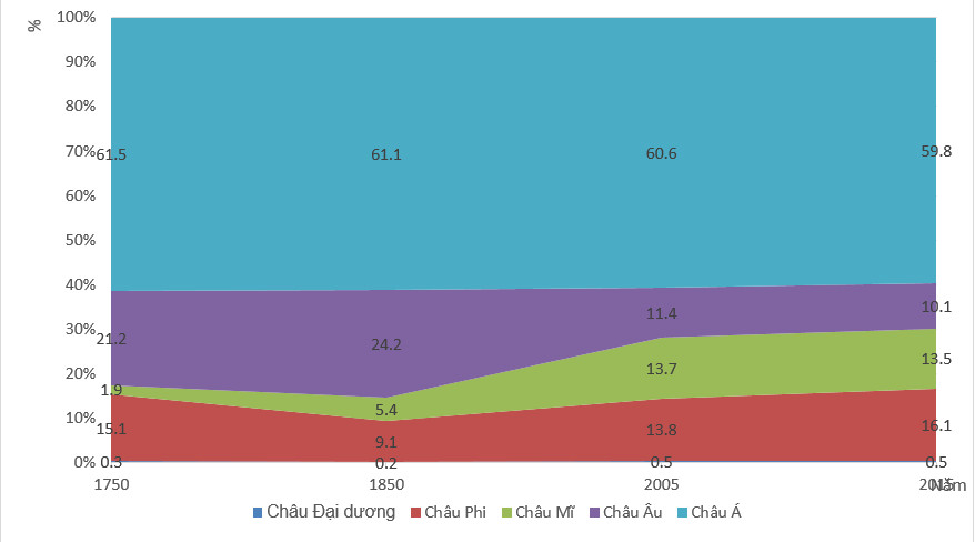 Câu 5. Cho biểu đồ thể hiện sự thay đổi cơ cấu dân số thế giới phân theo các châu lục giai đoạn 1750-2015