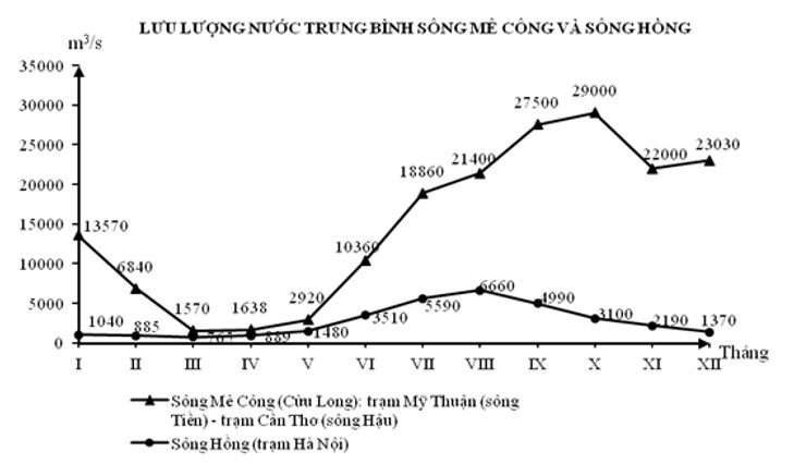 D. Sông Mê Công có lưu lượng nước trung bình các tháng đều lớn hơn và tháng đỉnh lũ muộn hơn sông Hồng.