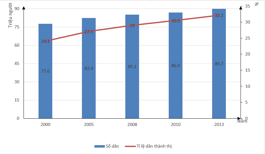 Câu 32. Cho biểu đồ thể hiện dân số nước ta và tỉ lệ dân thành thị từ năm 2000 đến 2013.