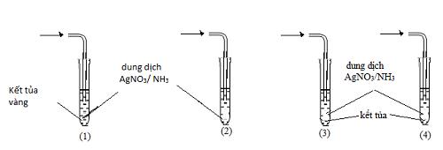 Câu 6: Có 4 bình khí mất nhãn là: axetilen, propin, but-1-in, but-2-in. Người ta làm thí nghiệm với lần lượt các khí, hiện tượng xảy ra như hình vẽ sau: