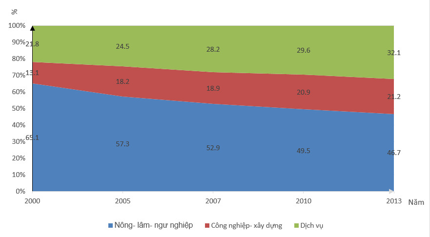 CƠ CẤU LAO ĐỘNG PHÂN THEO KHU VỰC KINH TẾ GIAI ĐOẠN 2000-2013 (%)