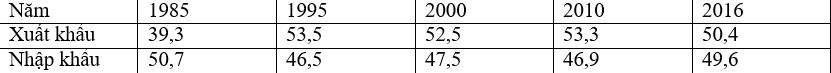 Căn cứ vào bảng số liệu, cho biết nhận xét nào sau đây là đúng về sự thay đổi cơ cấu giá trị xuất, nhập khẩu của Trung Quốc trong giai đoạn 1985 – 2016?
