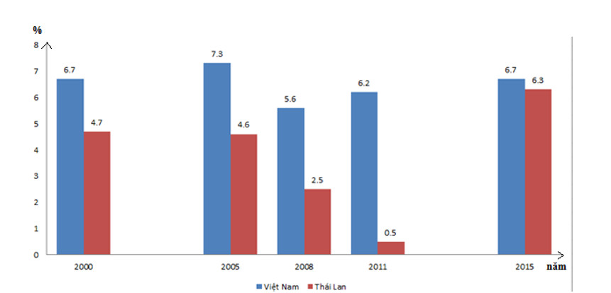 D. Năm 2015, tốc độ tăng trưởng GDP của Việt Nam cao hơn Thái Lan 1,4%.