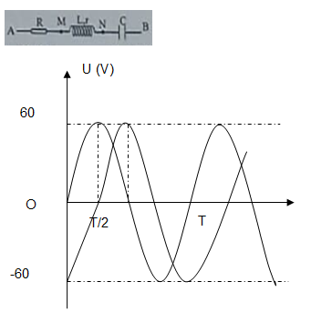 Câu 38: Đặt điện áp xoay chiều u = U0 cos (\(\dfrac{{2\pi }}{T}t + \varphi \) ) (V) vào hai đầu đoạn mạch AB như hình bên. Biết R = r. Đồ thị biểu diễn điện áp uAM và uMB như hình vẽ bên cạnh. Giá trị của U0 bằn