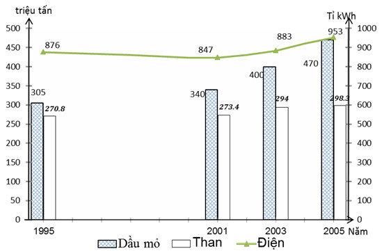 Sản lượng dầu mỏ, than, điện của Liên bang Nga từ 1995-2005