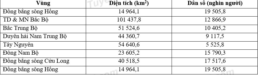 Diện tích và dân số các vùng ở nước ta năm 2014