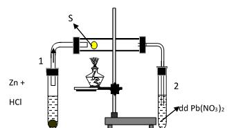 Câu 61: Cho phản ứng giữa lưu huỳnh với hidro như hình vẽ sau, trong đó ống nghiệm 1 để tạo ra H2, ống nghiệm thứ 2 dùng để nhận biết sản phẩm trong ống. Hãy cho biết hiện tượng quan sát được trong ống nghiệm 2 là: