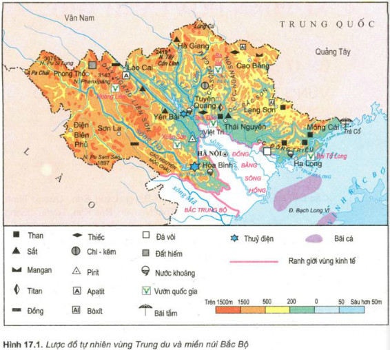 Dựa vào hình 17.1, xác định vị trí các mỏ:  than, sắt, thiếc, apatit và các dòng sông có tiềm năng phát triển thuỷ điện: sông Đà, sông Lô, sông Gấm, sông Chảy.