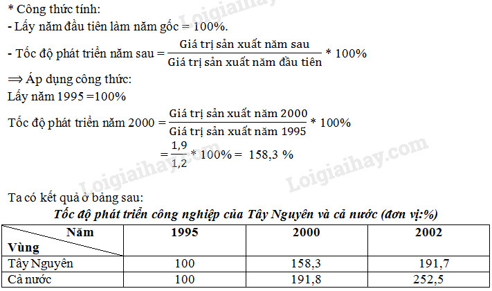 Dựa vào bảng 29.2, tính tốc độ phát triển công nghiệp của Tây Nguyên và cả nước (lấy năm 1995 =100%). Nhận xét tình hình phát triển công nghiệp ở Tây Nguyên.
