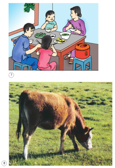 +Hình 7: Cả gia đình đang ăn cơm. Bữa cơm có cơm, rau, thức ăn.