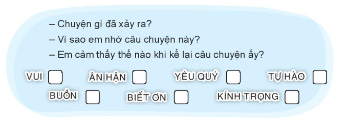 Nhớ lại một câu chuyện giữa em và thầy cô khiến em nhớ mãi không quên. Em có thể kể bằng cách lần lượt trả lời các câu hỏi gợi ý ở trên.