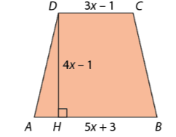 Cho hình thang ABCD có \(AB = 5x + 3,DC = 3x – 1\) và chiều cao \(DH = 4x – 1\) với \(x > 1\) (Hình 1.11). Chứng minh rằng diện tích của hình thang này bằng \(16{x^2} – 1.\)