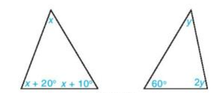 \(\begin{array}{l}x + x + {20^o} + x + {10^o} = {180^o} \Rightarrow 3x = {150^o} \Leftrightarrow x = {50^o}\\y + 2y + {60^o} = {180^o} \Rightarrow 3y = {120^o} \Leftrightarrow y = {40^o}\end{array}\)