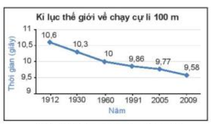 Bài 1 (5.10). Biểu đồ sau cho biết kỉ lục thế giới về thời gian chạy cụ li 100 m trong các năm từ 1912 đến 2009. a) Kỉ lục thế giới về chạy cự li 100 m đạt được ở năm 1991 là bao nhiêu giây? b) Từ năm 1912 đến 2009, kỉ lục thế giới về chạy cự li 100 m đã giảm được bao nhiêu giây?
