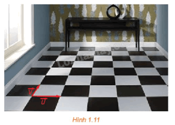 Trong việc lát sàn nhà như Hình 1.11, viên gạch ở hàng dọc thứ 4 từ trái sang và hàng ngang thứ 2 từ dưới lên là ảnh của viên gạch ở góc dưới bên trái qua phép tịnh tiến theo vectơ nào? (Gợi ý: Tính vectơ tịnh tiến đó theo hai vectơ \(\overrightarrow u ,\overrightarrow v \) trên hình vẽ).