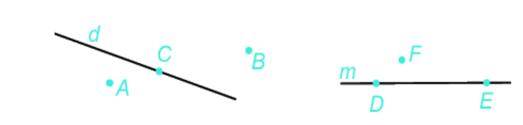 Bài 1 (8.39).Quan sát hình dưới rồi cho biết trong các khẳng định sau, khẳng định nào đúng, khẳng định nào sai? a) Điểm C thuộc đường thẳng d, hai điểm A và B không thuộc đường thẳng d. b) Ba điểm A, B, C không thẳng hàng. c) Điểm F không thuộc đường thẳng m. d) Ba điểm D,E,F không thẳng hàng.