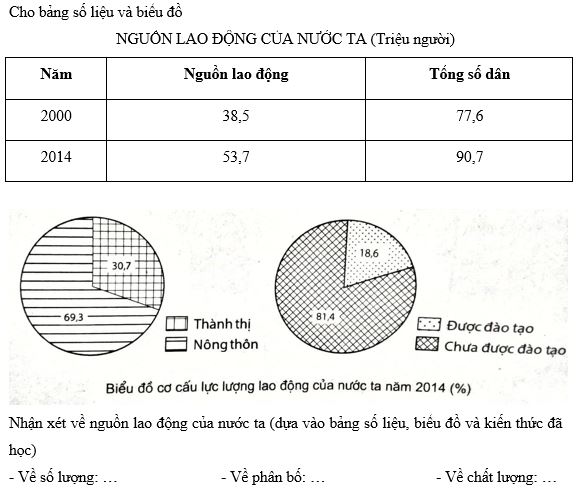 Giải bài 1 trang 12 vở bài tập Địa lí 9, Cho bảng số liệu và biểu đồ Nhận xét về nguồn lao động của nước ta (dựa vào bảng số liệu, biểu đồ và kiến thức đã học) – Về số lượng: … – Về phân bố: … – Về chất lượng: …