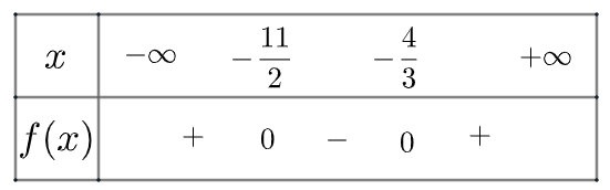 Vậy \(f\left( x \right)\) dương trong khoảng \(\left( { – \infty ; – \frac{{11}}{2}} \right) \cup \left( { – \frac{4}{3}; + \infty } \right)\) và âm trong khoảng \(\left( { – \frac{{11}}{2}; – \frac{4}{3}} \right)\)