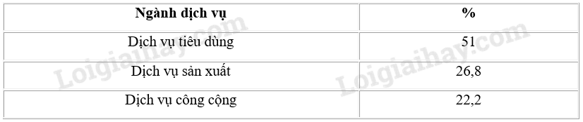 – Nhận xét: Tỷ trọng các nhóm dịch vụ trong cơ cấu ngành dịch vụ là không giống nhau. Dịch vụ tiêu dùng chiếm tỉ trọng cao nhất: 51%, tiếp theo là dịch vụ sản xuất chiếm 26,8%, dịch vụ công cộng chiếm tỉ trọng thấp nhất là 22,2%.